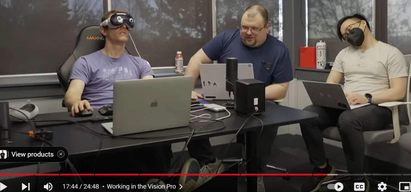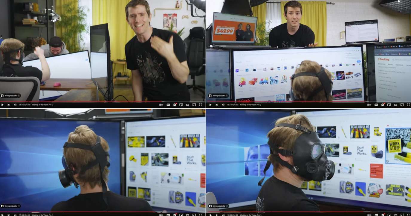 同一段视频包括对AVP环境的幽默模拟。在其中一个场景中(下文),一个人戴着防毒面罩(模拟头显),周围则是三个非常大的显示器/电视。他们展示了用户需要大幅度转动头部来看到所有的内容。LTT没有提到显示器的角度分辨率相当低,而这就是为什么显示器需要这么大的原因。