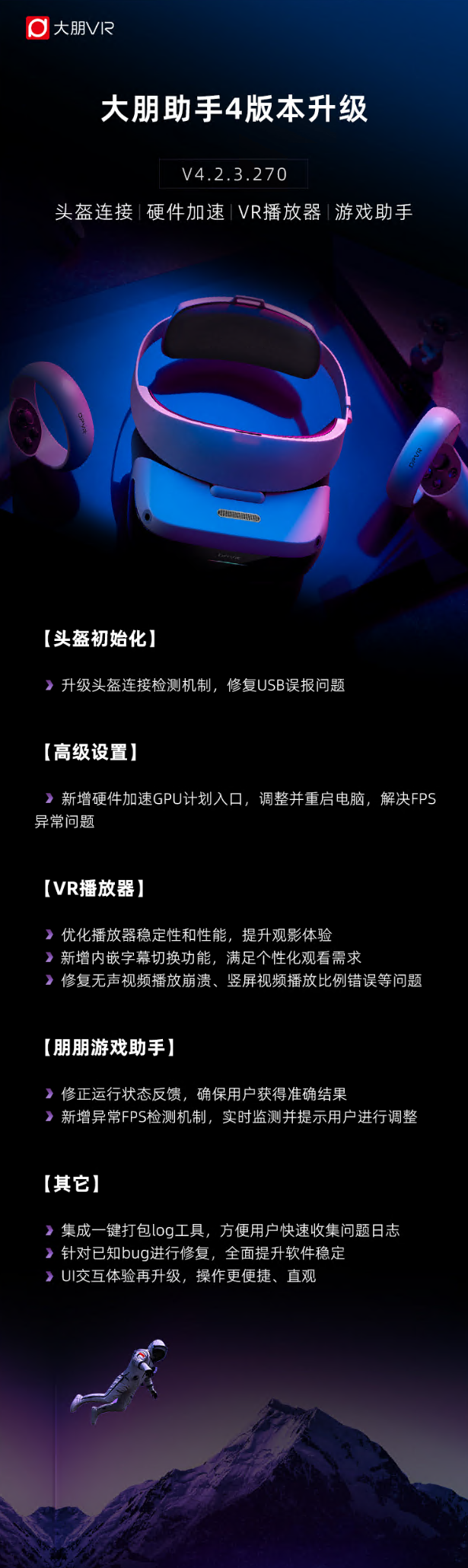 3月29日,大朋助手4迎来了4.2.3.270版本更新。此次更新针对头盔、硬件、VR播放器、朋朋游戏助手等多项内容进行了针对性优化,带来了更良好的连接、佩戴、游戏体验,让广大“大朋友”们更好地在虚拟世界中交互游玩。