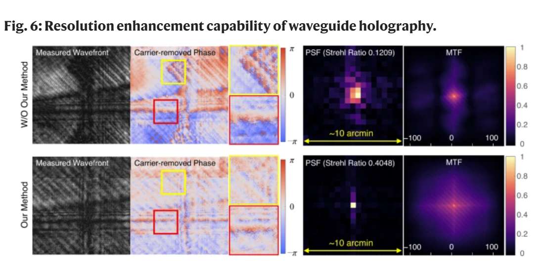 实验验证了显示完整3D图像的能力及进一步扩展,从而实现了一个右软件控制的大视窗。另外,团队证明所述方法提供了超越传统波导显示极限的增强分辨率。