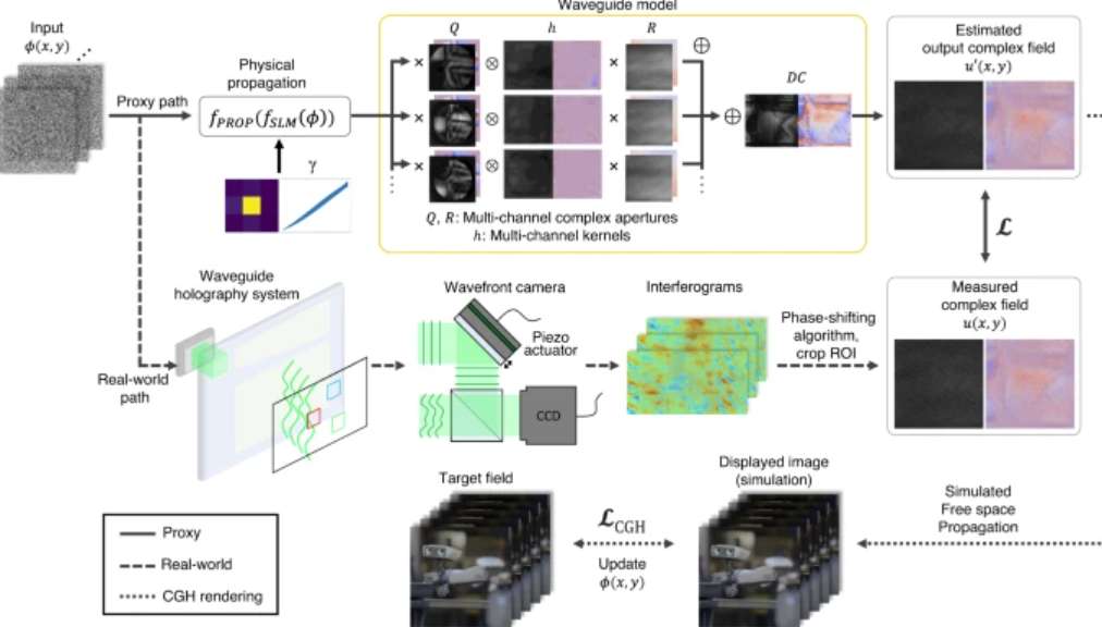 首先,所有复杂的相互作用都可以简化为单个卷积操作。与之宗波导内不同路径的所有光相互作用相比,这种解释的计算效率更高。在此基础上,研究人员建立了一个可微正演模型以用于模型标定和CGH绘制。