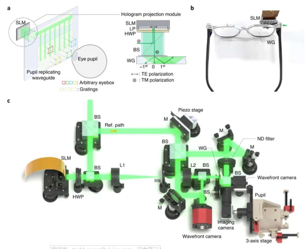 所以在“Waveguide holography for 3D augmented reality glasses”的研究中,Meta和韩国首尔大学的团队提出了一种紧凑的近眼显示系统:waveguide holography/波导全息。它结合了波导图像组合器和全息显示的优点。