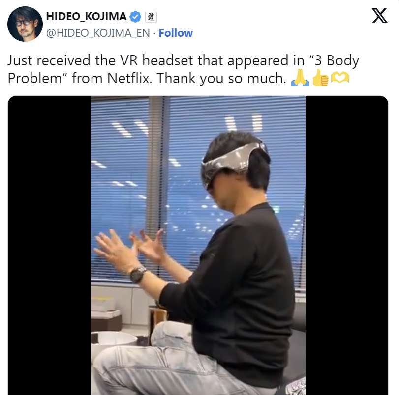分享了自己穿戴的“三体”VR头显的效果。可以看到,这位带来了《合金装备》和《死亡搁浅》等著名作品的日本游戏制作人好像真的是的在使用这款特别的VR头显一样。