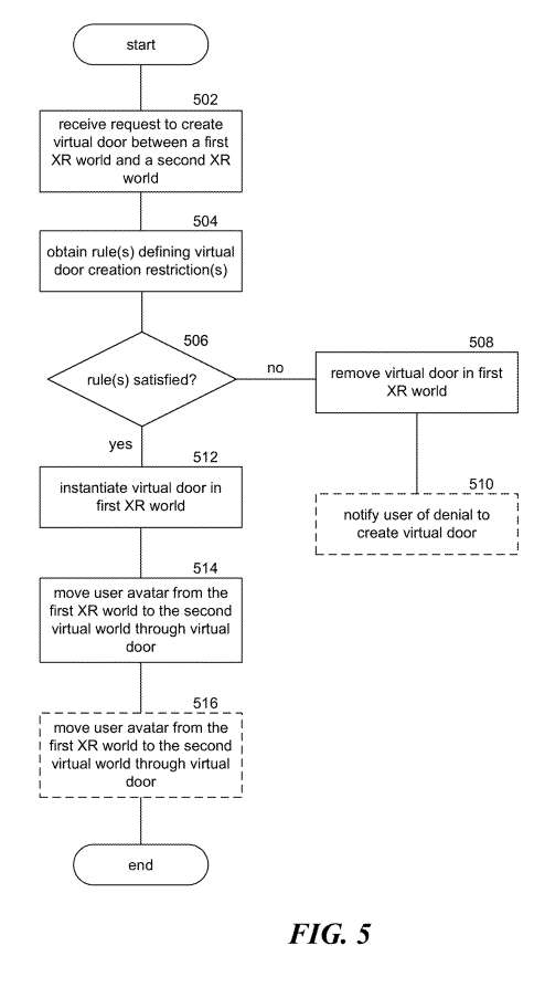 在502,进程500收到用户的请求,请求在第一个XR世界和第二个XR世界之间创建一个虚拟门。在不同的实施例中,第一和第二XR世界在同一个XR宇宙中,但由不同的所有者创建和维护。在其他实施例中,第一个XR世界是第一个XR宇宙中的世界,而第二个XR世界是第二个XR宇宙中的世界。