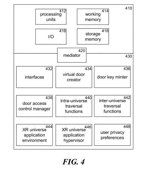 虚拟门创建器434可以与XR宇宙应用程序接口,以方便创建和操作连接同一XR宇宙中的两个位置和/或连接不同XR宇宙中的两个位置的虚拟门。每个XR领域都可以实现自己的HTTP URL模式、RPC协议、API和/或其他编程访问,以发出创建、访问、修改或删除该XR领域内资产的请求。