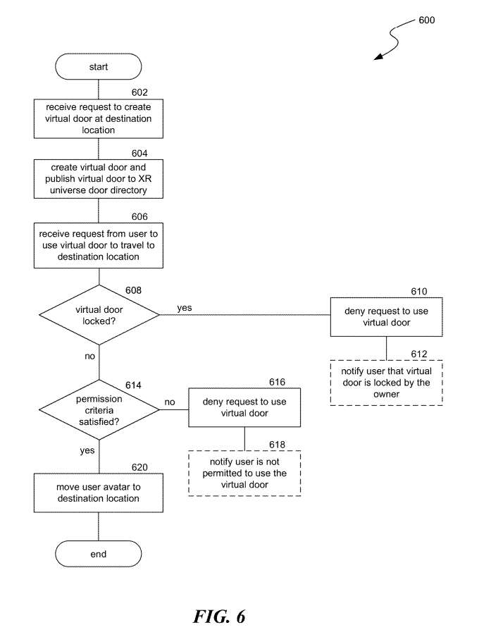 在604,进程600可以创建虚拟门,并将虚拟门的存在发布到XR宇宙门目录、数据库或列表中。在一个实施例中,财产的所有者可能会设计他们的财产,并打算授予其他用户访问它的权限,例如在开放参观、晚会或其他活动期间。在其他情况下,所有者可能希望将虚拟门列在其财产的目录中,以允许朋友和/或其他用户找到该门。进程600可以将新创建的虚拟门添加到可搜索列表中,鼓励其他人发现或找到他们的财产。