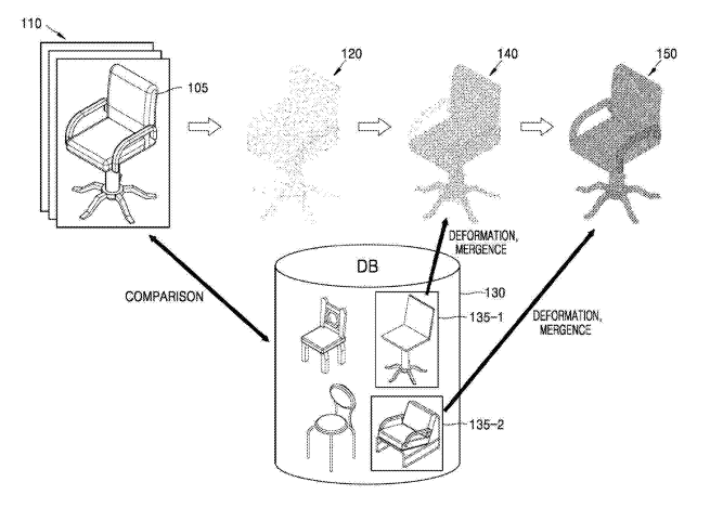 在一个实施例中,专利描述了一种生成3D模型的方法和用于生成3D模型的设备。所述方法包括生成对象的基本3D模型,从存储多个3D模型的3D模型数据库中确定与该基本3D模型相似的第一目标3D模型,生成第一合成3D模型,确定第一合成三维模型与至少一个对象图像之间的第一相似性,确定第一综合三维模型与该至少一个物体图像之间具有低相似性的分量,从3D模型数据库确定相对于具有低相似度的分量与第一合成三维模型具有高相似性的三维模型作为第二目标3D模型并生成第二合成三维模型。
