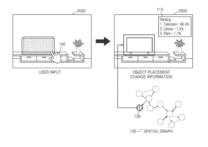 在一个实施例中,专利描述了一种提供与将对象放置在空间中有关的信息的方法,包括获得与空间相对应的三维空间数据和空间中的第一对象的对象相关数据,基于三维空间数据以及对象相关数据获得包括该空间中第一对象之间的位置关系的空间图,接收用于改变该空间中对象放置的用户输入,基于用户输入,将表示要放置在该空间中没有放置第一对象的空区域中的第二对象的空节点添加到该空间图中,通过将已经添加了空节点的空间图应用到图神经网络(GNN)来更新空间图,并且输出用于基于更新的空间图的空间。