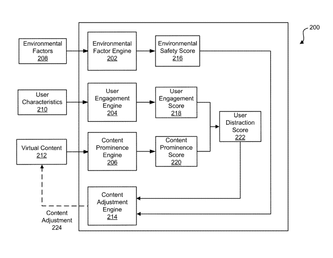 在一个实施例中,专利描述了用于动态调整由扩展现实系统提供的虚拟内容的技术。系统确定扩展现实系统的用户由于扩展现实系统提供的虚拟内容而分心的程度。系统确定用户由于虚拟内容引起的分心程度是否超过或小于分心阈值程度,其中分心阈值程度至少部分地基于与用户所处的真实世界环境相关联的一个或多个环境因素来确定。系统同时基于用户由于虚拟内容引起的分心程度是否超过或小于分心阈值程度的确定来调整虚拟内容的一个或多个特性。
