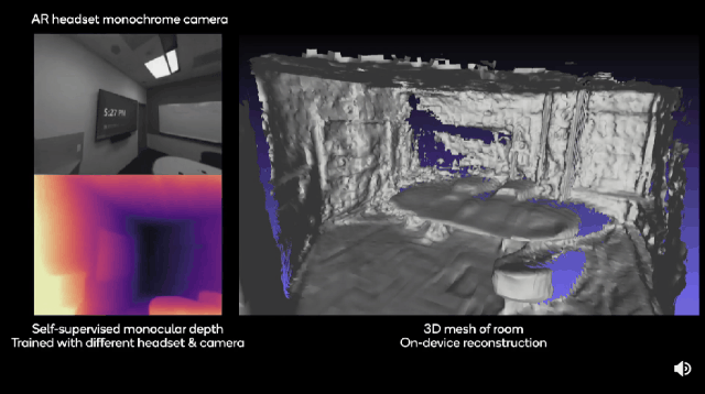 这是高通此前利用自监督神经网络单眼深度估计技术在AR眼镜上实现的3D建模效果: