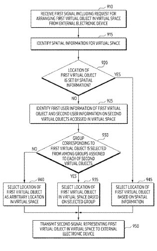 在一个实施例中,专利描述的电子设备包括至少一个处理器,处理器配置为从外部电子设备接收第一信号,第一信号包括用于在虚拟空间中布置第一虚拟对象的请求。所述至少一个处理器配置为通过使用关于第一虚拟对象的第一用户信息和关于第二虚拟对象的第二用户信息,在分别对应于第二虚拟对象的组中获得与第一虚拟对象对应的组。至少一个处理器配置为基于包括在与第一虚拟对象相对应的组中的至少一个第二虚拟对象的位置来识别虚拟空间中的第一位置。所述至少一个处理器配置为向所述外部电子设备发送第二信号,所述第二信号表示布置在所述虚拟空间中的所识别的第一位置中的所述第一虚拟对象。
