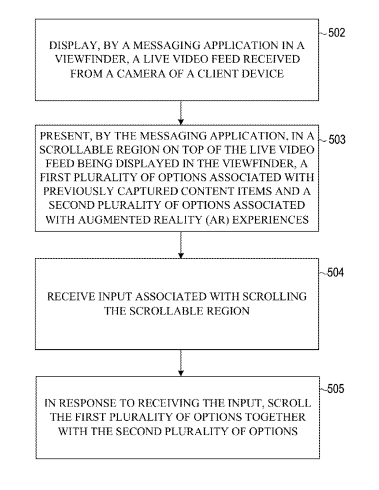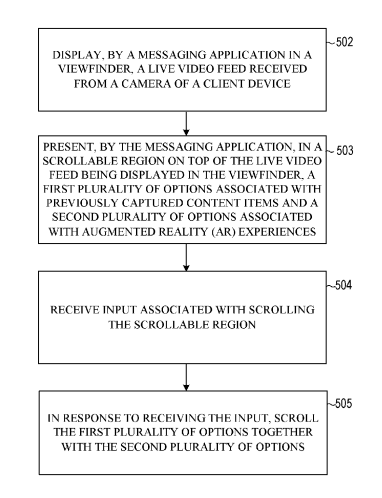 在一个实施例中,专利描述的方法由消息应用程序呈现在GUI中显示的实时视频馈送顶部的可滚动区域中。GUI包括取景器、与先前捕获的内容项目相关联的第一多个选项和与AR体验相关联的第二多个选项。系统将所述第一多个选项与所述可滚动区域的所述第二多个选项一起滚动,以将所述第一多个选项中的一个或所述第二多个选项之一聚焦。作为响应,系统根据第一方式修改GUI的配置,或者根据第二方式修改GUI配置。