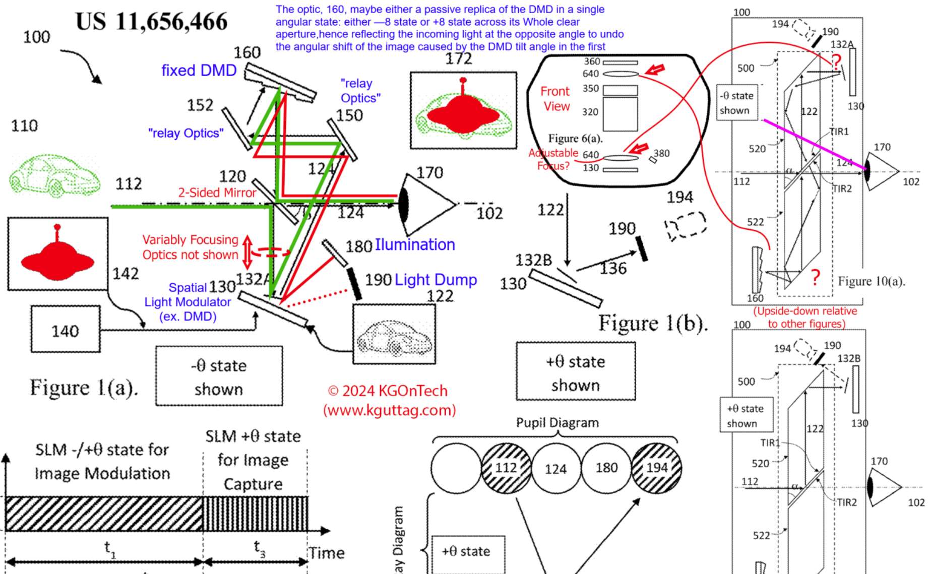 除了不偏振外,光线同时需要经历一条更为痛苦的光路,其中包括一个“固定DMD”,通过时间复用显示和遮蔽DMD来校正现实世界的微倾斜。除了在第一代设计中遇到的所有问题外,我发现将相对较小的反射镜(图1a中的120)放在视图中间非常有问题,因为反射镜上方或下方的视图看起来与反射镜中的视图非常不同。
