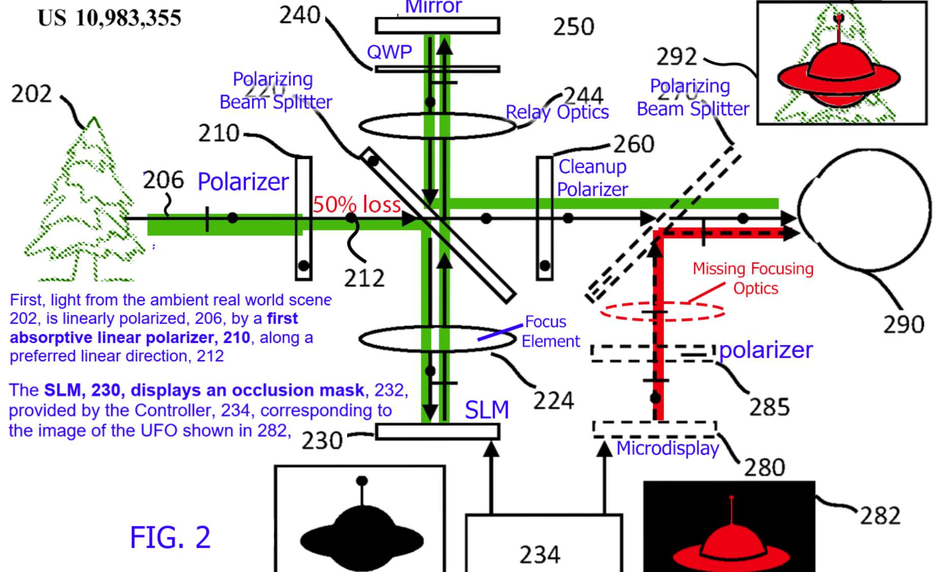 现实世界的视图需要经过一条相当痛苦的路径。首先,它通过一个偏振器,其中至少有50%的光丢失(理论上这个偏振器是多余的,但它很可能用于减少伪影)。然后,它通过一个对焦元件从偏振分束器反射回来,将现实世界对焦到LCOS SLM。LCOS装置将改变任何未被遮蔽的偏振,以便它在通过对焦元件的回程中通过偏振分束器。