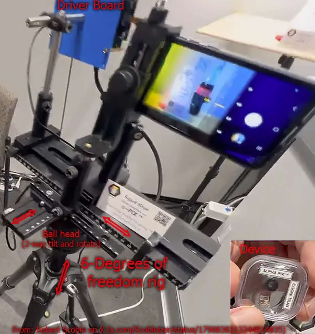 当我拍摄上面的照片时,我原本没有打算写一篇文章,所以没有拍下完整的设置。幸运的是,科技博主罗伯特·斯考伯(Robert Scoble)发布了一段相关的X视频。图中的六轴装备支持以六个自由度对齐相机和Cogni Trax设备。只有当场景中的所有对象都处在相对于相机/设备的精确位置时,这个演示才会起效。