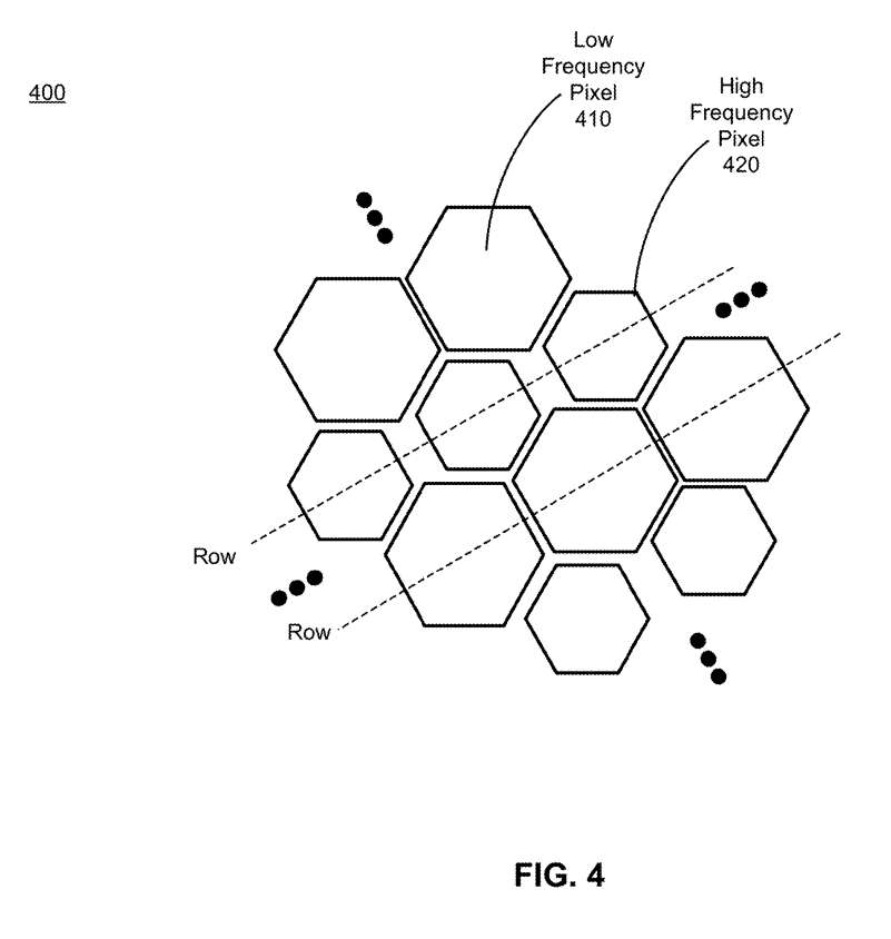 在所示示例中,iToF传感器包括两组像素,一组低频组和一组高频组。低频组包括配置为检测以第一频率调制的光的像素,并且高频组包括配置为检测以高于第一频率的第二频率调制的光的像素。例如,第一频率可以是10mhz,第二频率可以是100mhz。如图所示,低频像素比高频检测像素具有更大的检测区域。