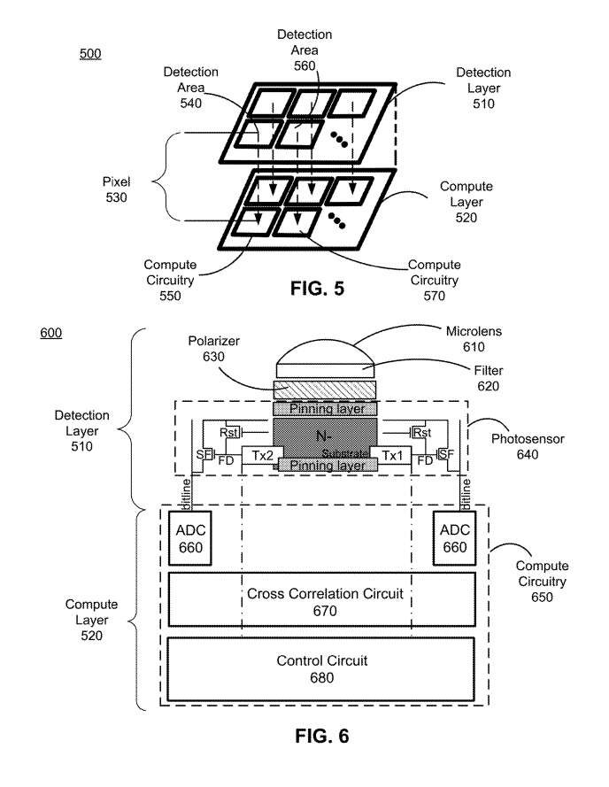 相互关联电路670配置为基于从ADC 660输出的一个或多个数字信号,或从ADC 660输出的一个或多个数字信号和配置为检测具有不同调制频率的光的相邻像素来确定估计深度。
