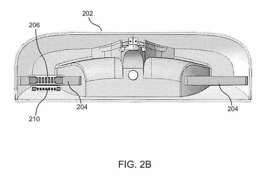 图2B的图200B显示了具有相同组件的外壳202的下半部分,但接收器线圈210放置在发射器线圈206的对面。。发射线圈和接收线圈相邻定位,两者之间的分离距离小,可以实现高效率充电。