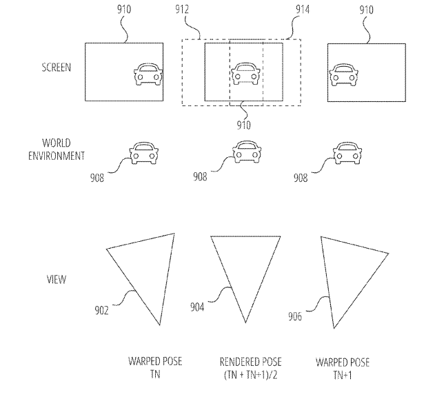 在一个实施例中,专利描述了一种用于调整AR设备中显示器的过度渲染区域的方法,包括识别显示设备的角速度、显示设备的最新姿态、先前的扭曲姿态和先前的过度渲染区域,并基于角速度、最近姿态、先前弯曲姿态和先前过度渲染区域的组合来调整动态过度渲染区域的大小。