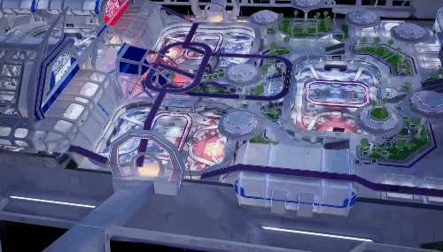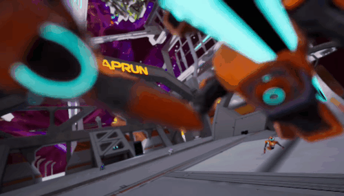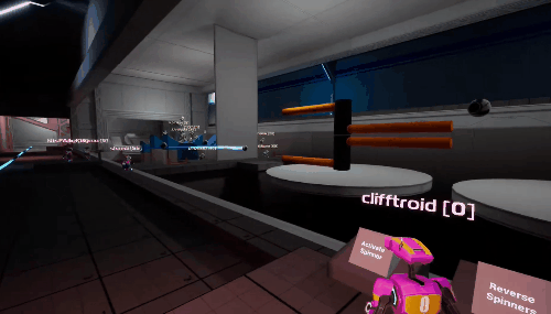 游戏还在测试阶段,并未提供任何教程,玩家可以自行摸索或是主动与他人交流。在低重力的环境下使用角色手腕上的小型喷气装置,轻轻一跳就能跨越大半个区域。太空站的边缘有可以在各区域穿行的高速轨道,玩家只需要用手握住蓝色的传送带就可以在空中疾驰滑行。
