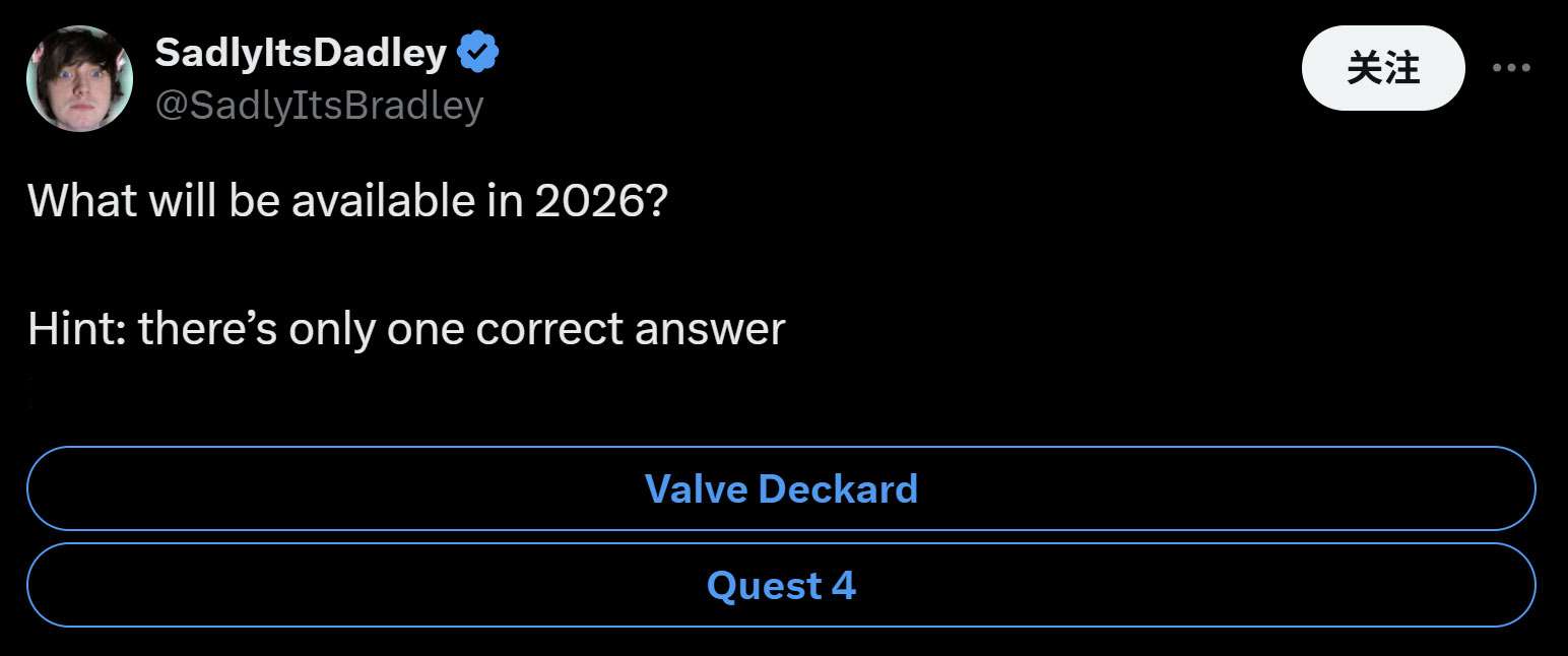 (映维网Nweon 2025年06月03日)XR消息人士布拉德·林奇日前发文称,2026年不会有Quest 4出现,但2026年Meta会有新硬件,只是与Quest系列无关。同时,他在X发起了投票,询问大家2026年会有哪款头显发布,并附上两个选择Valve Deckard和Quest 4,而且强调正确答案只有一个。