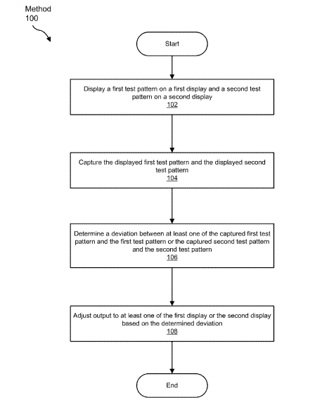 在一个实施例中,在第一显示器上显示第一测试图案,在第二显示器上显示第二测试图案,并捕获所显示的第一测试图案和所显示的第二测试图案。确定捕获的第一测试图案和第一测试图案或捕获的第二测试图案和第二测试图案中的至少一个之间的偏差。基于所确定的偏差来调整对第一显示器或第二显示器中的至少一个的输出。