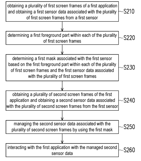 在一个实施例中,获取第一应用的多个第一屏幕帧,并从第一传感器获取与第一屏幕帧关联的第一传感器数据;确定每个第一屏幕帧内的第一前景部分;基于每个第一屏幕帧内的第一前景部分和与第一屏幕帧关联的第一传感器数据,确定与第一传感器关联的第一掩模;获得所述第一应用的多个第二屏幕帧,并从所述第一传感器获得与第二屏幕框相关联的第二传感器数据;通过使用第一掩模来管理与第二屏幕帧相关联的第二传感器数据;以及利用所管理的第二传感器数据与第一应用交互。
