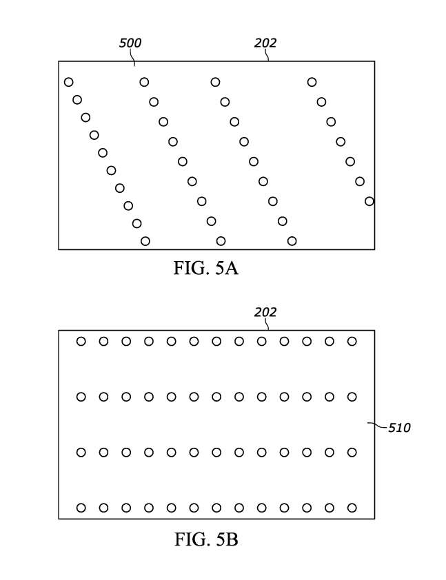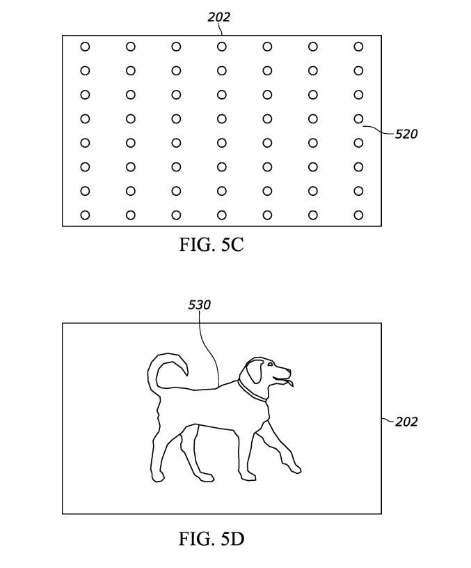 图5A-5D,显示不同的各自面板202,呈现不同的各自网点图案。如图5A所示,一个面板202可以呈现由点的对角线行建立的第一点图案500。图5B表明,另一面板202可以呈现由水平行点构成的第二点图案510,而图5C表明,又一面板202可以呈现由垂直行点构成的第三点图案520。然后,图5D示出除了点图案之外的其他图像,图5D的图202在本例中呈现狗的虚拟图像530。