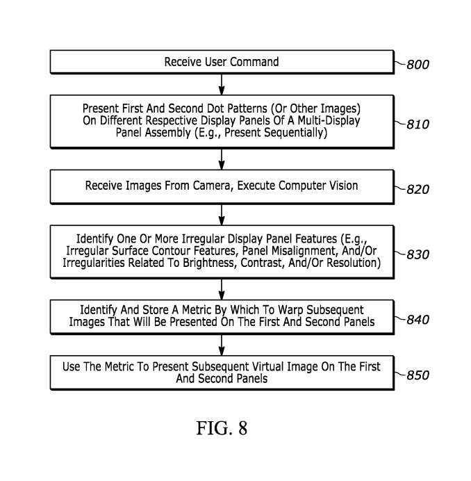 在820,系统可以从摄像头接收一个或多个图像,所述图像显示第一和第二点图案。同样在820,系统可以执行计算机视觉,以在830基于来自摄像头的图像识别与第一显示面板和/或第二显示面板相关的一个或多个不规则显示面板特征。