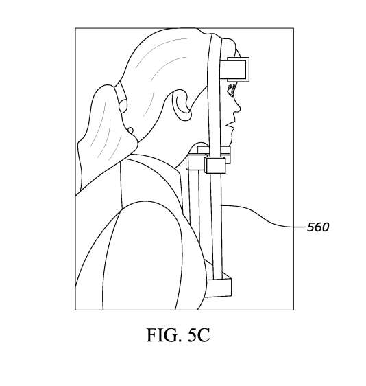 图5A和5B所示,摄像头505可以与计算机视觉一起使用,以确定用户位置和视角POV。或者,基于用户将头部置于如图5C所示的头部稳定组件560内,可以已知/假设用户位置,并且已知/假设视角。所以,可以将组件560放置在预先配置的距离和高度,以便稳定用户的头部并引导其直接朝箱体400内看。