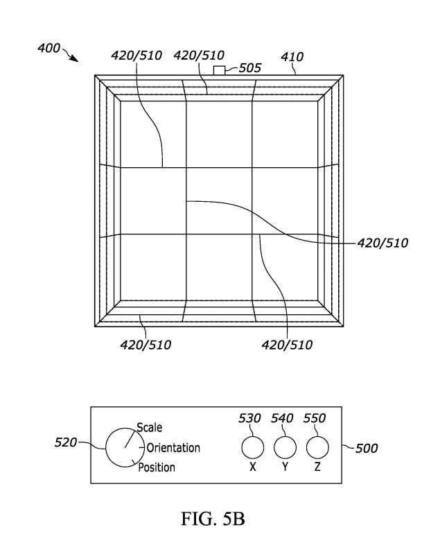 在分别将拨盘520旋转到方向模式或位置模式后,用户可以类似地使用相应的拨盘540、550在X、Y和Z维度旋转或位置移动网格510。所以,可以调整虚拟网格510,直到用户感知到虚拟网格510与图5B中所示的真实网格420对齐/匹配为止。