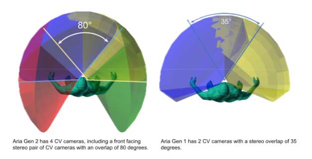 高动态范围HDR: Aria Gen 2的全局快门摄像头传感器提供了120 dB的高动态范围,而Gen 1的范围仅为70 dB。这允许在不同的照明条件进行卓越的计算机视觉任务。