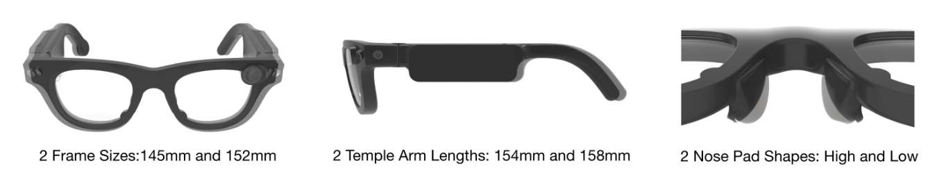 Aria Gen 2拥有卓越的可穿戴性,增强了舒适性和贴合性,同时可适应广泛的面形,并提供了丰富的传感器套件来支持研究目的。这款眼镜保持了轻巧的设计(根据尺寸的不同,重量在74 – 76克之间),而且现在包括折叠臂,便于日常使用的储存和运输。为了确保每个用户都有最佳的面形和功能匹配,团队引入了八种不同尺寸,并考虑了一系列不同的因素,包括头宽和鼻梁的变化。