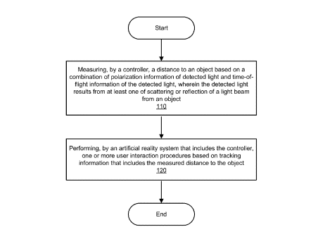 在一个实施例中,由控制器基于检测光的偏振信息和检测光的飞行时间信息的组合来测量到物体的距离,其中检测光是由光束从物体散射或反射中的至少一种引起的。由包括控制器的人工现实系统基于包括到对象的测量距离的信息执行一个或多个用户交互过程。