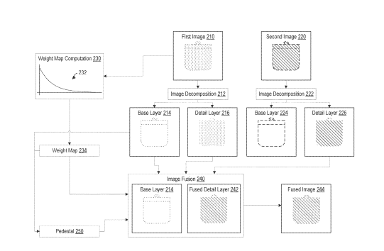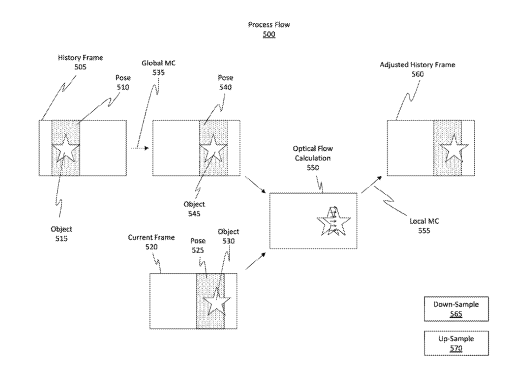 在一个实施例中,专利描述了用于生成时间滤波图像的技术,其中图像设计为补偿摄像头的全局运动和补偿对象的局部运动。获取历史帧和当前帧。对历史帧执行全局运动补偿操作,以重新投影历史帧的姿态以匹配当前帧的姿态。将历史帧与当前帧进行比较,以识别表示运动对象的像素。对于像素中的每一个,计算光流矢量。然后将光流矢量应用于像素,以将像素移动到新的位置。历史帧中的新位置对应于当前帧中标识的位置。然后,用历史帧对当前帧进行时间滤波。