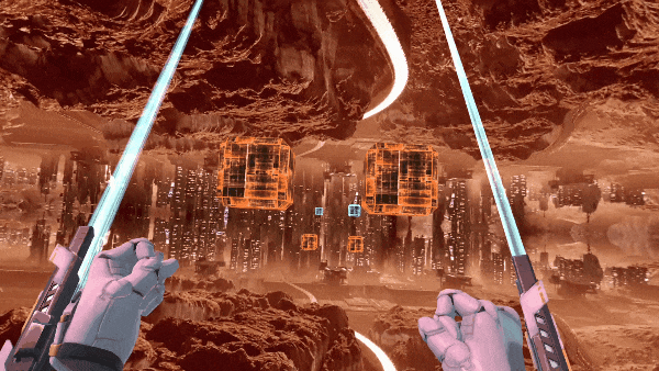 节奏光剑是比较让人意外的一个体验场景,没想到在VR大空间的体验环境中,去玩节奏光剑竟然毫无违和感。在高维空间中,玩家的双手会化为光剑,根据节奏切碎以太碎块,以开辟通路。PICO巧妙地将节奏光剑中击打碎块的场景融入到了《太空奥赛德》中,既有打游戏的快感,又有内容的深层感。