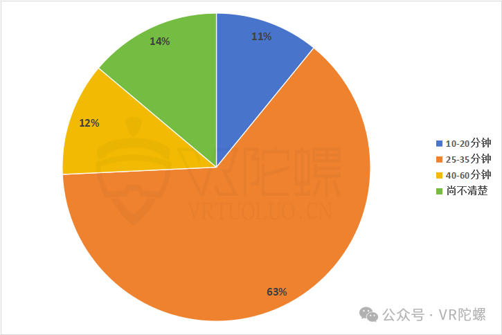从内容体验时间分布上来看,算是今年变化比较大的一部分,由于去年大多数用户反馈带VR超过40分钟,会头疼或者眩晕以及其他疲累感,今年大多数项目都将时间控制在了30分钟左右,30分钟以下的项目几乎占据了半壁江山,共计有76个项目,市占达74%。