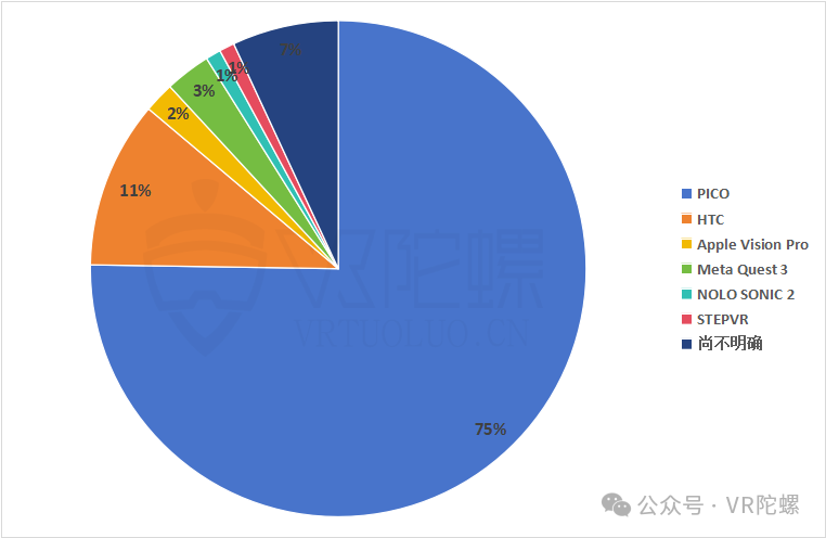从终端使用设备来看,今年PICO的市占实现了大幅提升,从去年的47%提升至75%,占据了绝对市场份额。主要原因还是由于今年新上线的项目不断涌现,同时可供选择的终端设备并不多,PICO则成为了最佳选择。其他设备如HTC、Meta等相比去年市占都有一定的缩减,不过值得一提的是,在继《山海空间》这一项目搭载Vision Pro之后,今年又出现了一个新的项目《无象之境》 ,使用Vision Pro作为终端体验设备。