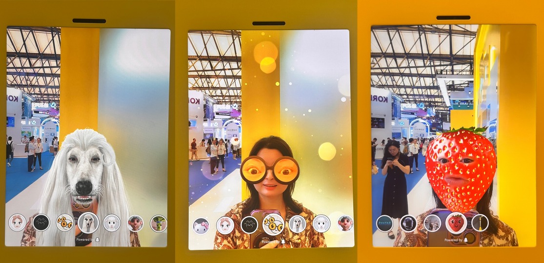Snap展台提供了大量的AR滤镜供观众体验拍照,站在“AR镜子”前就能瞬间化身为其中的虚拟形象,或是获得各种造型的装饰,镜子中的形象则会捕捉并还原用户的表情和动作,能沉浸式体验虚拟变装的乐趣。