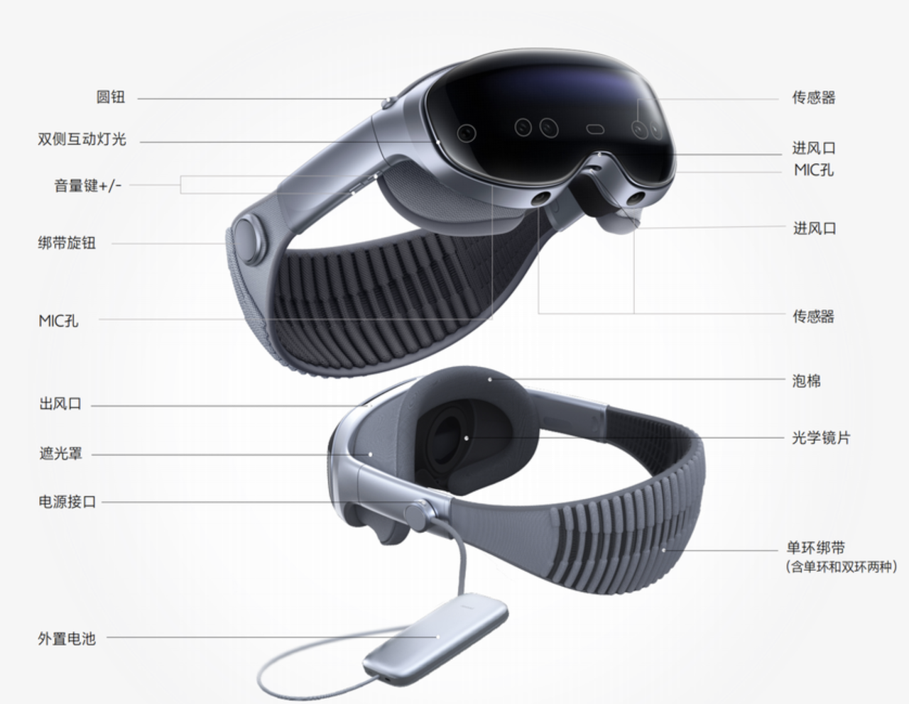 静态时与机身融为一体,点亮后则会透出紫色光晕,以柔和的光影点缀科技感。同时,头显侧面还设计了呼吸灯,在设备使用时会亮起微光,提示工作状态。