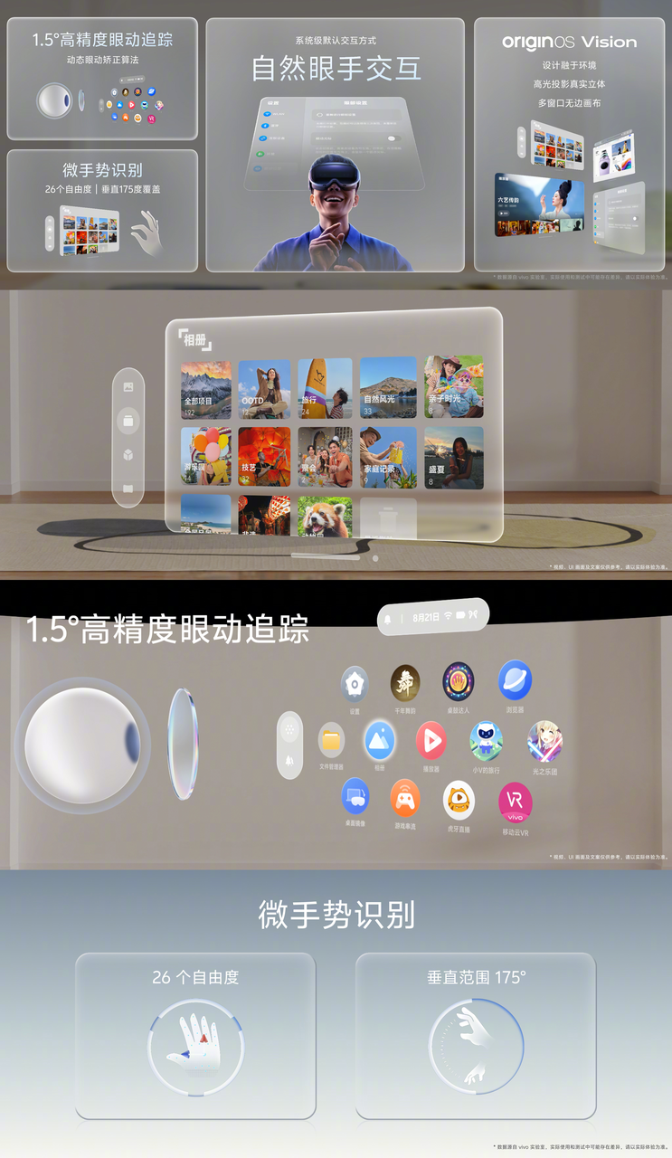 手眼协同是 vivo Vision 的核心交互方式。据称其实现了1.5°高精度眼动追踪,26 个自由度的微手势识别和垂直 175 度的识别范围。