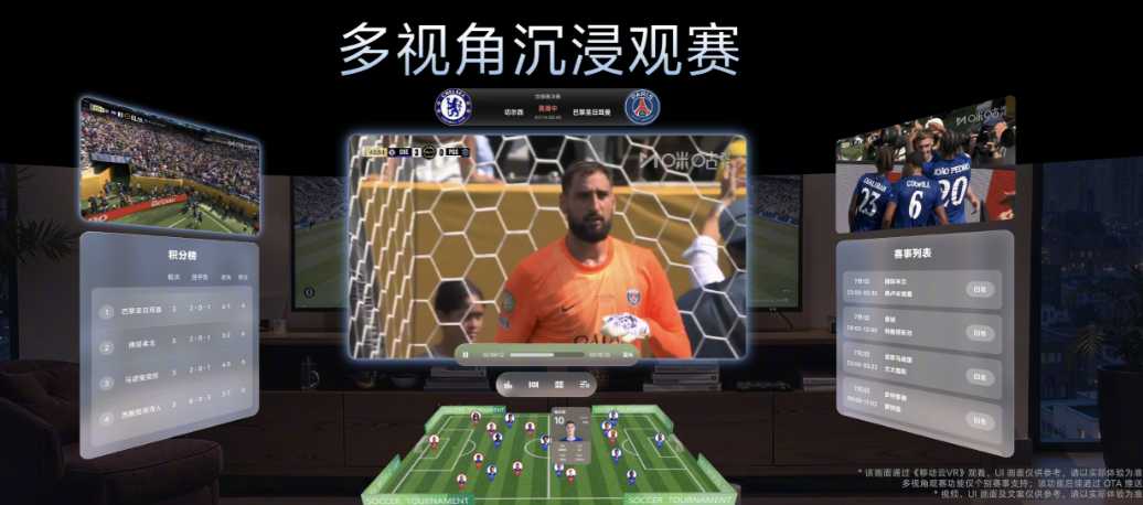 其他常规 2D 视频内容中,vivo 与咪咕视频合作,支持实时直播观赛。用户还可自由切换观赛视角,通过左右两块大屏实时显示比赛数据和信息。