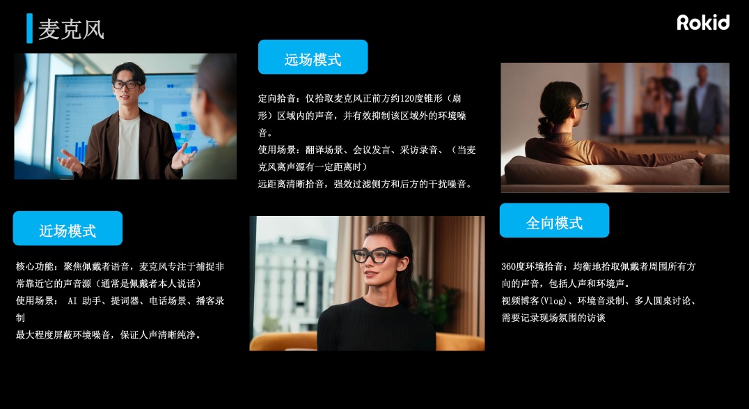 • 影像: 我们主张“不仅拍得到,还要拍得好”。相比无显示屏的眼镜,Rokid Glasses最大的优势是有取景框,用户可以调整头部姿势精准构图。我们还集成了防抖、降噪、夜景等多种算法,生成的视频流畅稳定。