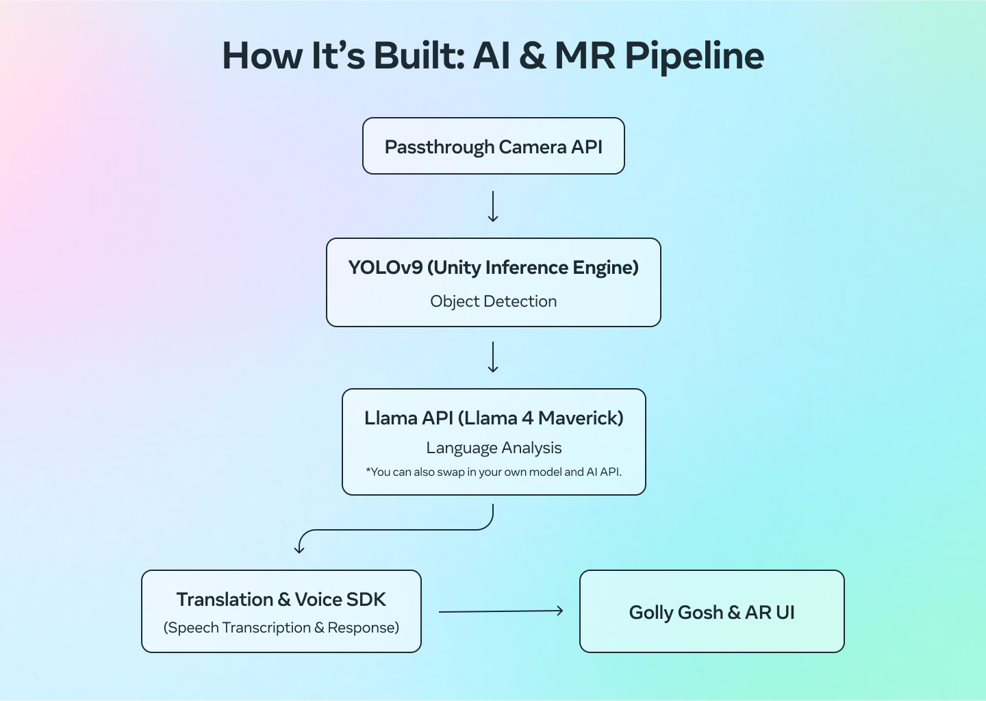 Spatial Lingo默认通过Llama API调用Llama 4 Maverick模型,将检测到的物体名称翻译为西班牙语并在MR中呈现。开发者也可通过GitHub开源项目替换为自有模型及AI API进行翻译。
