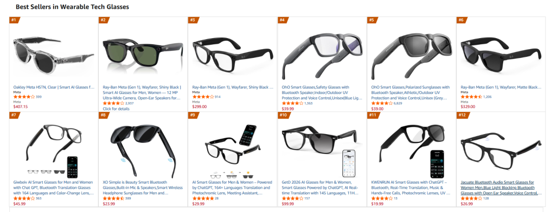 亚马逊专门设立了一个Best Sellers榜单(BSR),该榜单会不定期统计并更新畅销商品并给出相应的排名。对于AI眼镜,“Best Sellers in Wearable Tech Glasses”品类前12榜单如下。(统计时间2026年2月)