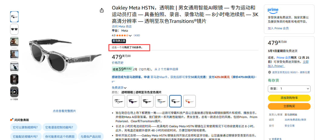 值得注意的是,BSR的统计会精确到某款产品的具体SKU,比如榜单第一名是Oakley Meta HSTN的透明款,页面显示“过去一个月购买了700+”。如果统计整个系列,这一销量数据会高得多。
