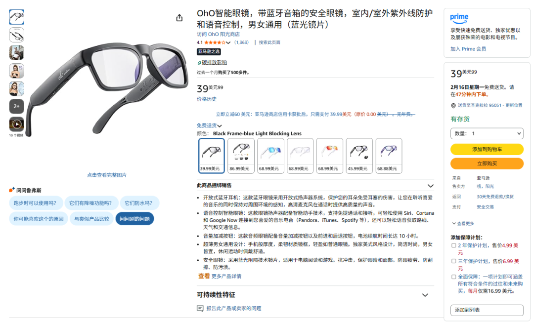 除Meta外,榜单剩下的产品均属于低价智能眼镜,价格最高100美元,价格最低居然只有20美元。在这其中,ohO智能眼镜有两款上榜,分别位居第四、第五名。它们均属于智能眼镜,以太阳镜为额外卖点,最低价格39美元。两款产品只有镜片差异,其中蓝光镜片款显示“过去一个月购买了500+”。眼镜评分4.1,共有1363条评价。