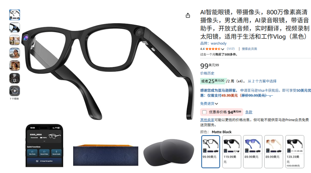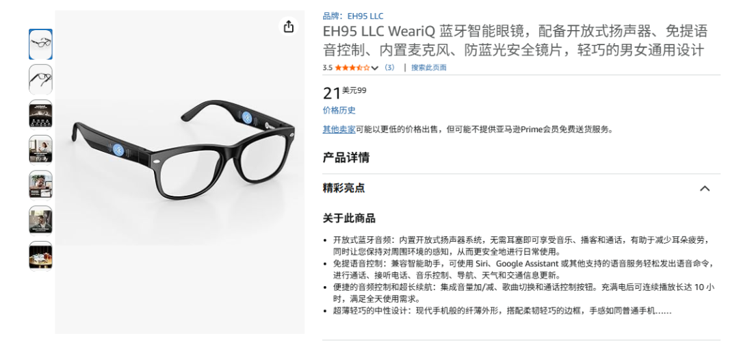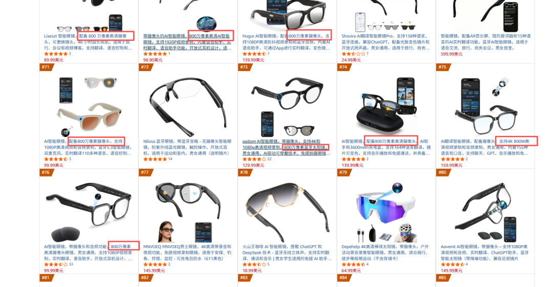 2、低价是很多产品的核心卖点。去年,VR陀螺曾参加了厦门眼镜展、深圳眼镜展等大大小小展会,当时国内陆续涌现出大量的低价AI眼镜,它们基于国产芯片方案,价格仅数百元,却支持音频、拍照以及AI大模型等功能,让人印象深刻。基于亚马逊榜单来看,美国很可能已经成为了华强北系平价AI眼镜出海的第一站。