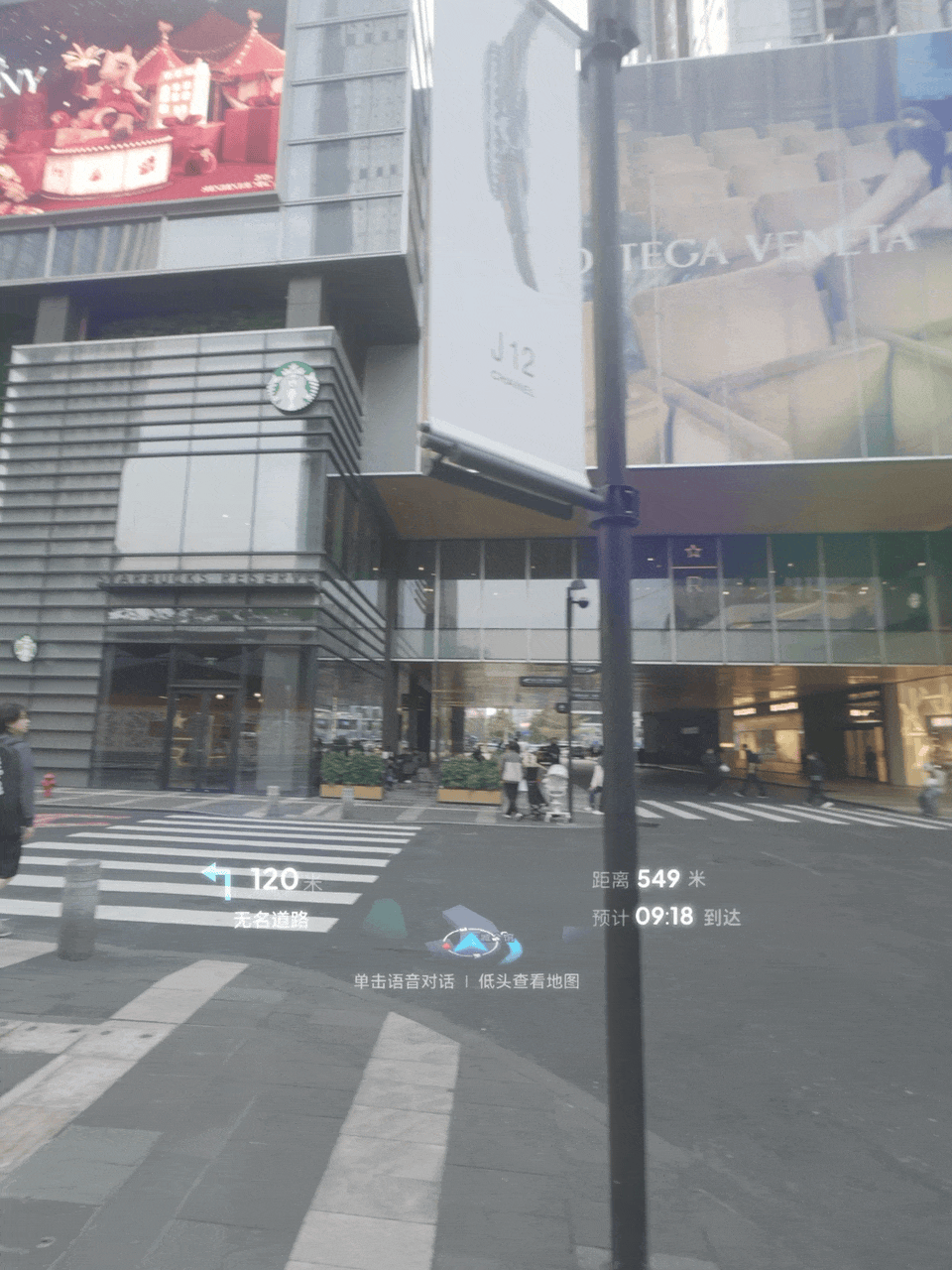 当确定目的地后,雷鸟X3 Pro展现出了空间计算设备在导航上的天然优势。平视时,X3 Pro会进入HUD导航模式,这个UI界面上下窄,左右宽,尽可能给用户腾出更多的视觉空间,在不遮挡用户视线的情况下,提供了足够的信息;当用户微微低头,界面则无缝切换为拥有全局视角的沙盘地图。