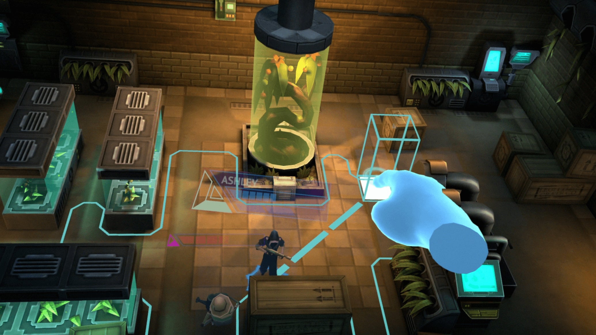 我的解决方案是将主角外化:将玩家(游戏行为主体)与故事的主角(故事行为主体)分离开来。在《Augmented Empire》中,玩家角色克雷文做出所有战术决策,但故事的主角是薇拉,她从冷漠自大的独行者发展成为富有魅力的革命领袖。在《Shadow Point》中,玩家扮演亚历克斯解谜并探索新世界(游戏行为主体),但我们观察到发生改变的是洛娜·麦凯布,她从自私任性的顽童成长为睿智慷慨的成年人(故事行为主体)。