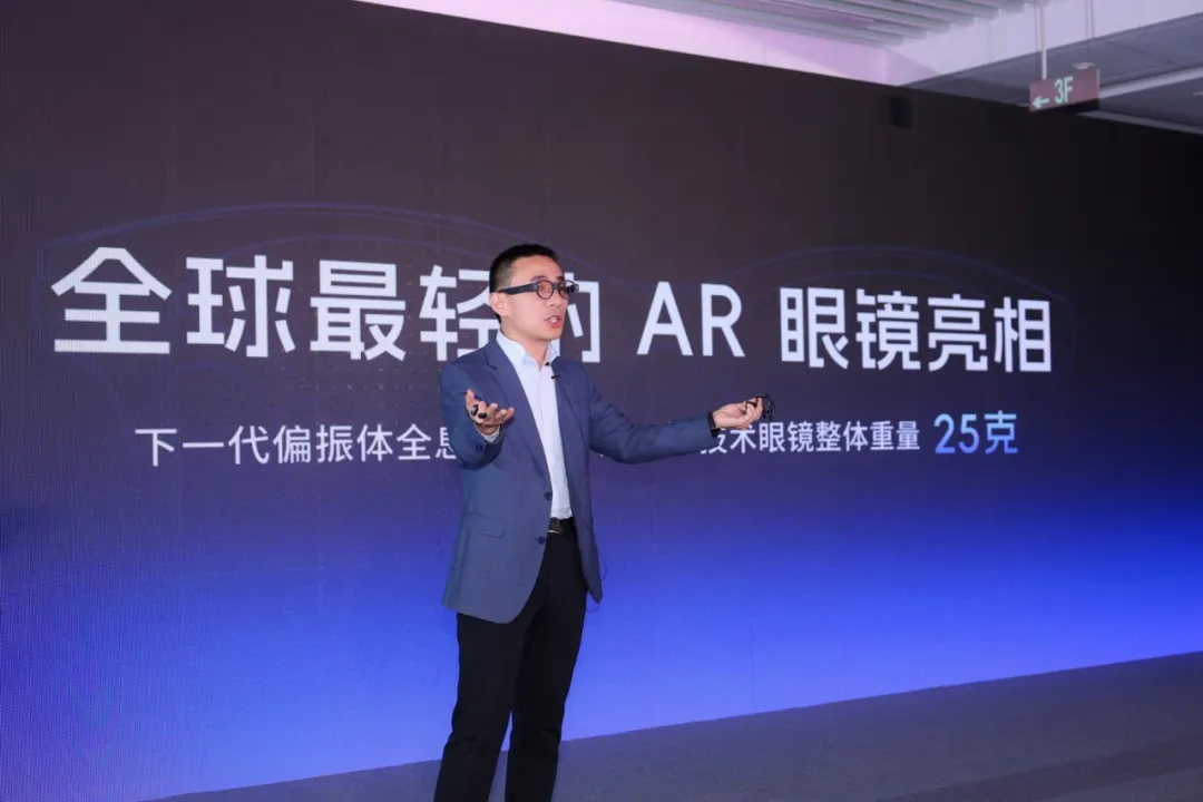 除了号称“全球最便宜”的全彩 AI+AR 智能眼镜 JOVE Glasses S1,发布会现场还亮相了一款轻薄形态的 AR 眼镜——JOVE Glasses Air。据介绍,该款产品由朱庇特智能与谷东智能联合研发、采用偏振体全息光波导(PVG)技术,整机重量控制在了 25 克。